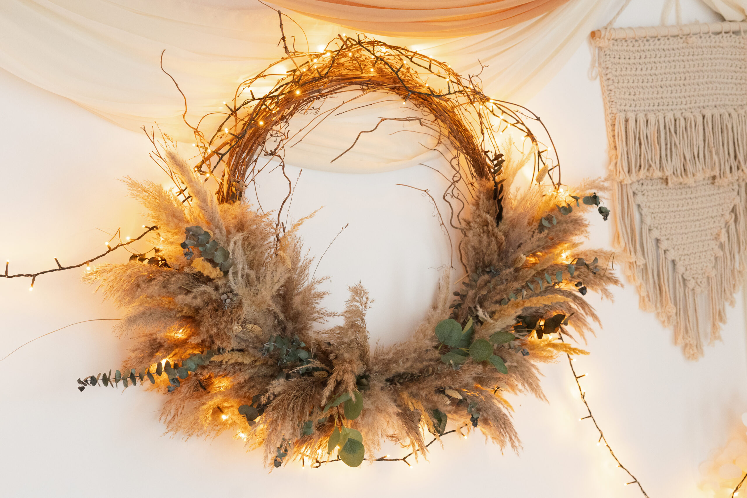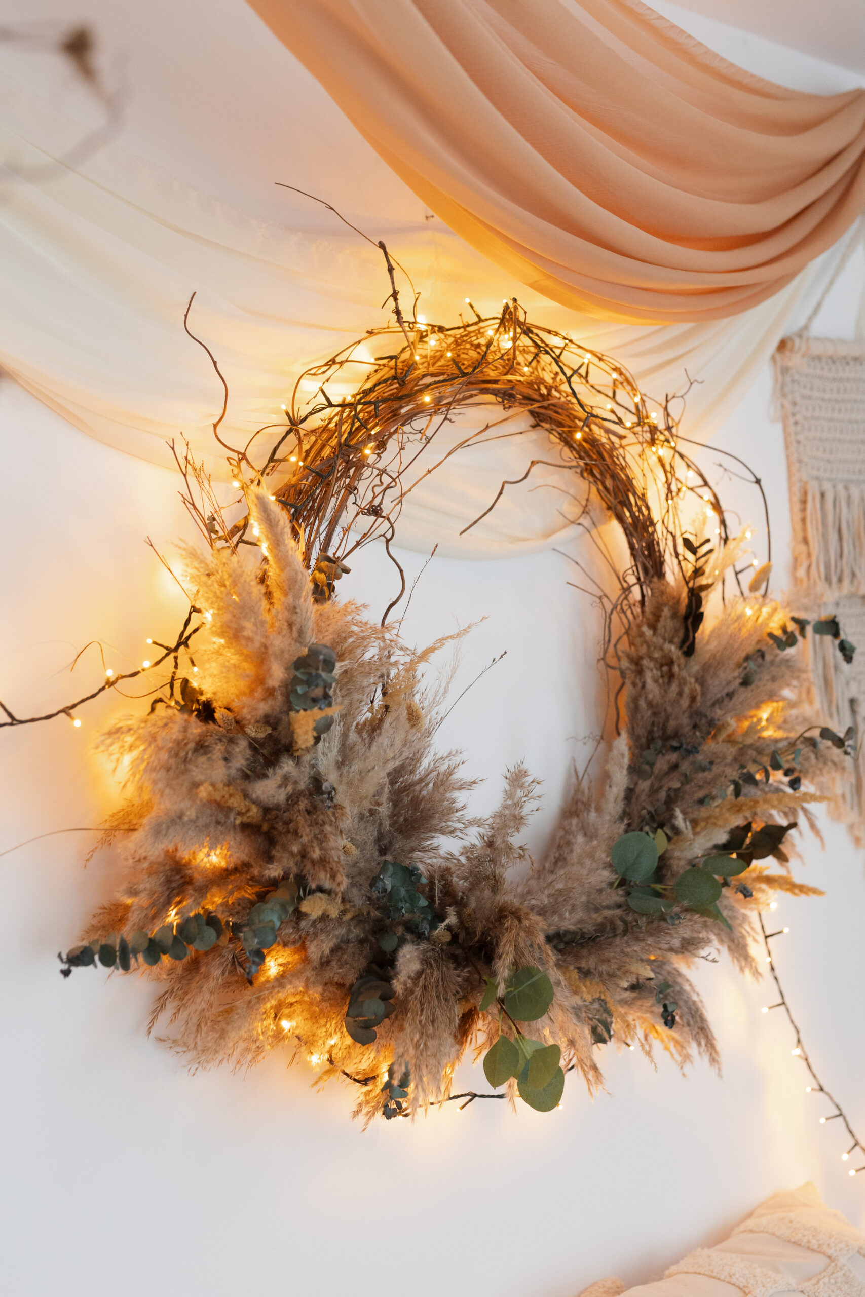 Coroniță decorativă realizată manual din crenguțe naturale, îmbinată armonios cu pampas pufos, eucalipt stabilizat și o selecție delicată de flori uscate. Designul său organic, cu texturi bogate și nuanțe calde, aduce un aer boem și relaxat în orice spațiu, fiind ideală pentru decoruri în stil boho, rustic sau minimalist. Se potrivește perfect atât în amenajarea unui studio foto, cât și ca piesă de accent în locuință – pe perete, ușă sau ca parte dintr-un aranjament mai amplu.